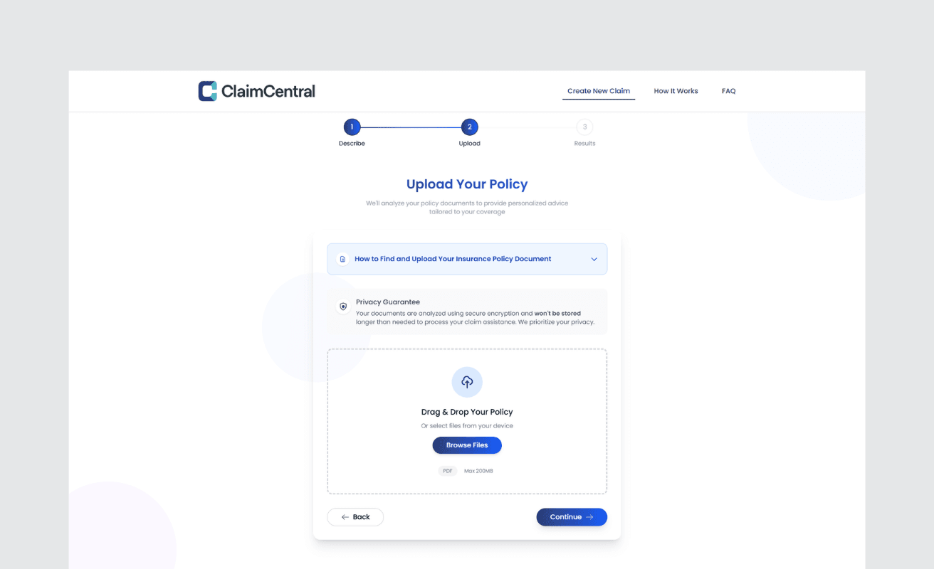 Claim Central AI simplifies insurance claims with AI-powered analysis & expert support. Upload your policy, describe your situation, & get personalized advice plus a professional claim letter, securely & in minutes, not days. Fast, accurate, & confidential.